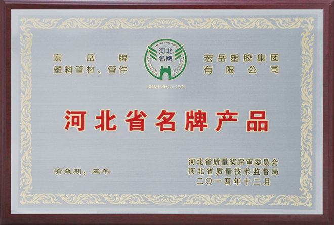 Хун-юе был признан высокотехнологичным предприятием в провинции Хэбэй, а пластиковые фитинги марки Хун-юе были признаны национальными продуктами без инспекции.