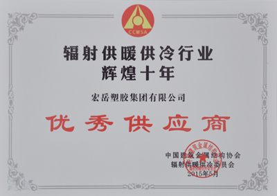 2015年5月15日,中国辐射供暖供冷委员会十周年庆典在北京盛大举行。会上表彰了一批对辐射供暖供冷行业发展作出突出贡献的企业和个人,华体会体育集团喜获中国辐射供暖供冷行业辉煌十年优秀供应商殊荣,华体会体育塑胶集团有限公司张思良总经理荣获中国辐射供暖供冷行业功勋奖。