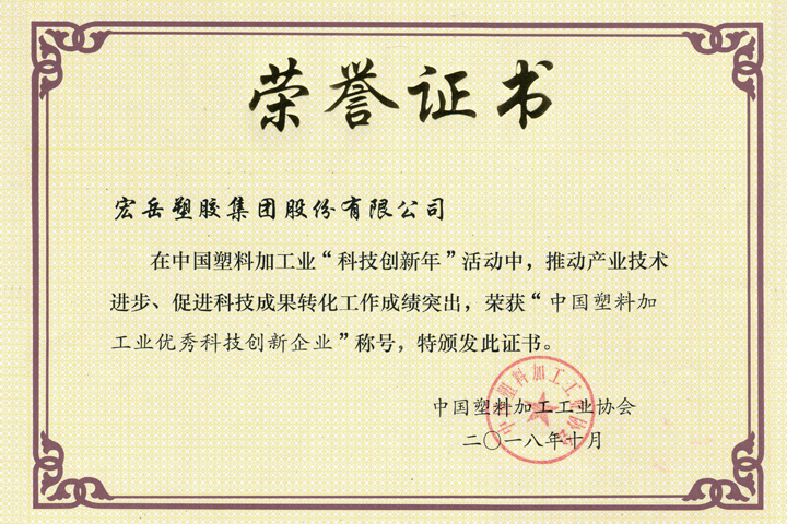 近日在中国塑料加工业“科技创新年”活动中,华体会体育集团在推动产业技术进步、促进科技成果转化工作成绩突出,荣获“中国塑料加工业优秀科技创新企业”称号,彰显了华体会体育加强科技创新和技术进步的信心和决心!