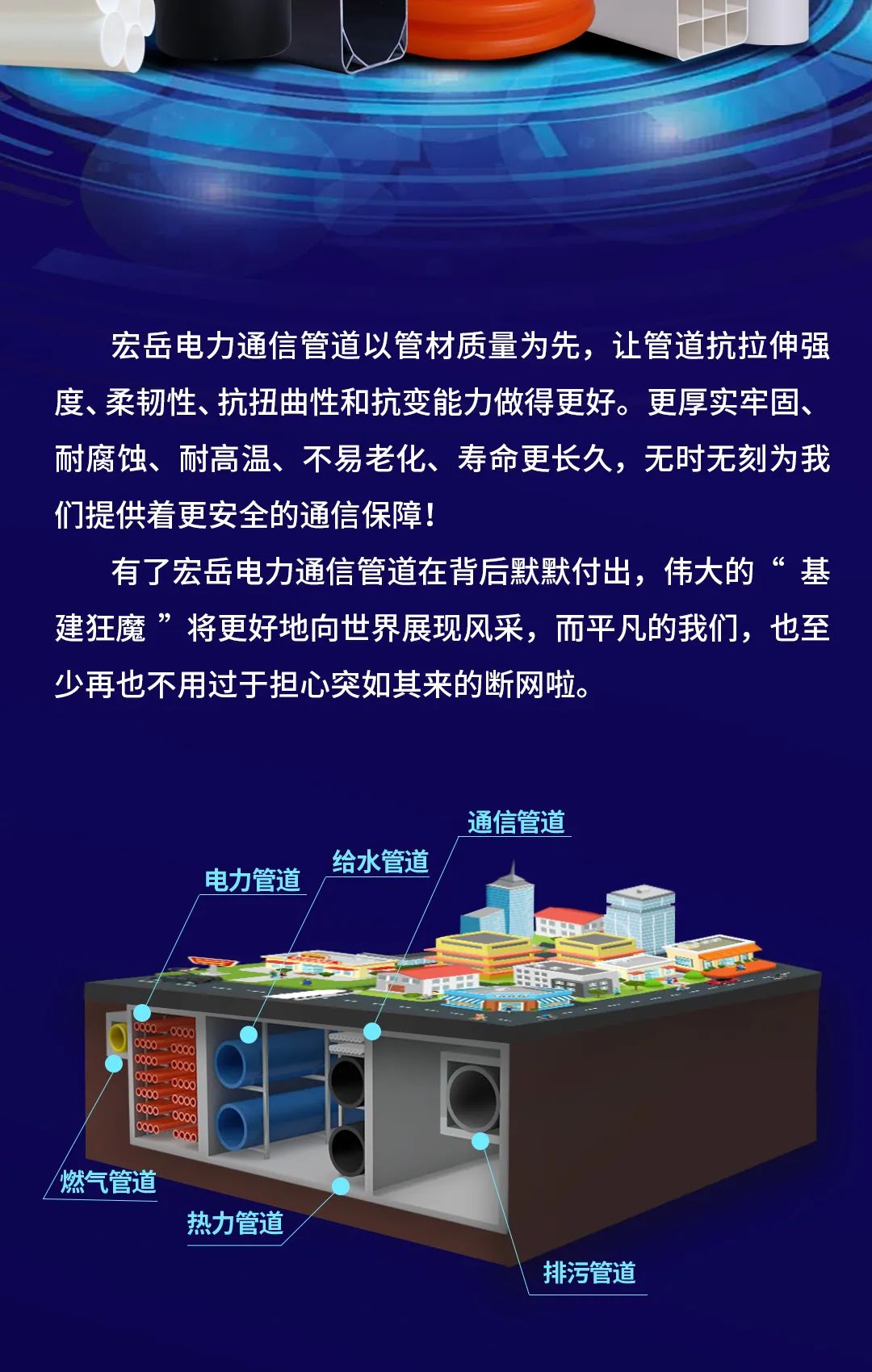华体会体育电力通信管道以管材质量为先,让管道抗拉伸强度、柔韧性、抗扭曲性和抗变能力做的更好。更厚实牢固、耐腐蚀、耐高温、不易老化、寿命更长久,无时无刻为华体会体育提供着更安全的通信保障!