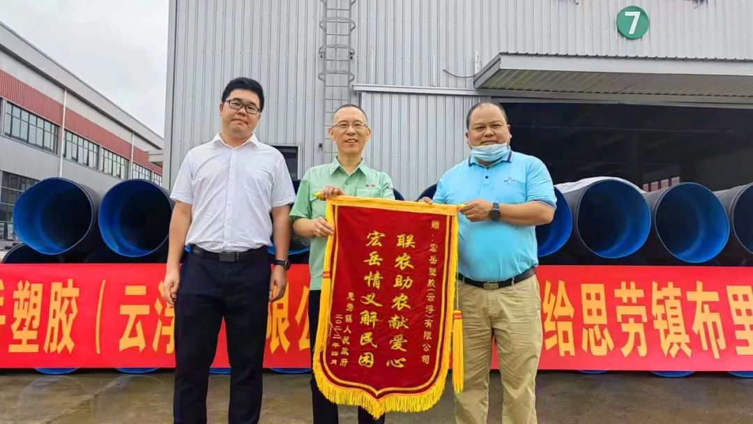 4月26日,华体会体育塑胶(云浮)公司向云浮市思劳镇布里村委捐赠PE双壁波纹管,及时高效地帮助该村解决了农田灌溉改造项目急需的管道材料。
