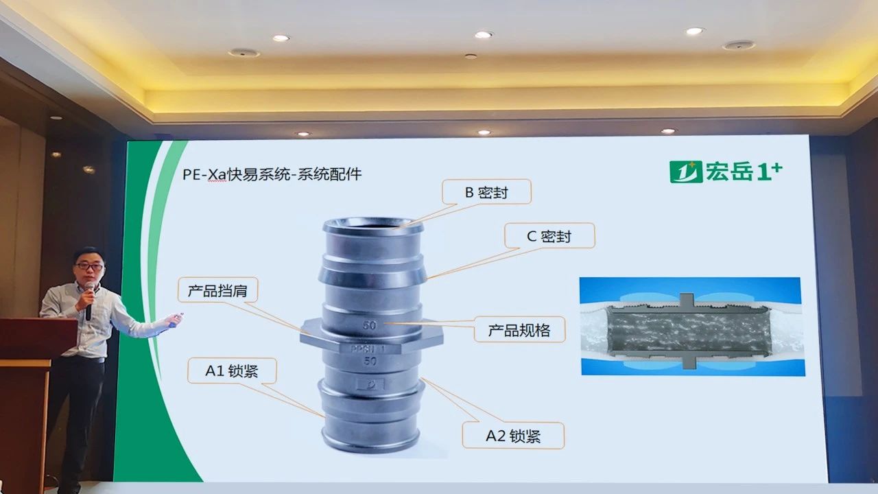 会议现场,华体会体育集团高级技术工程师陈工就集团规模概况做简要介绍,并就PE-Xa快易连接系统的特点以及在两联供管路安装上的优势进行详尽讲解。现场展台重点展示了PE-Xa快易连接管道系统,参会者纷纷驻足停留咨询了解、连接实操,此系统连接凭借其简单、快捷、安全的产品及连接优势,受到了与会者们的一致好评!