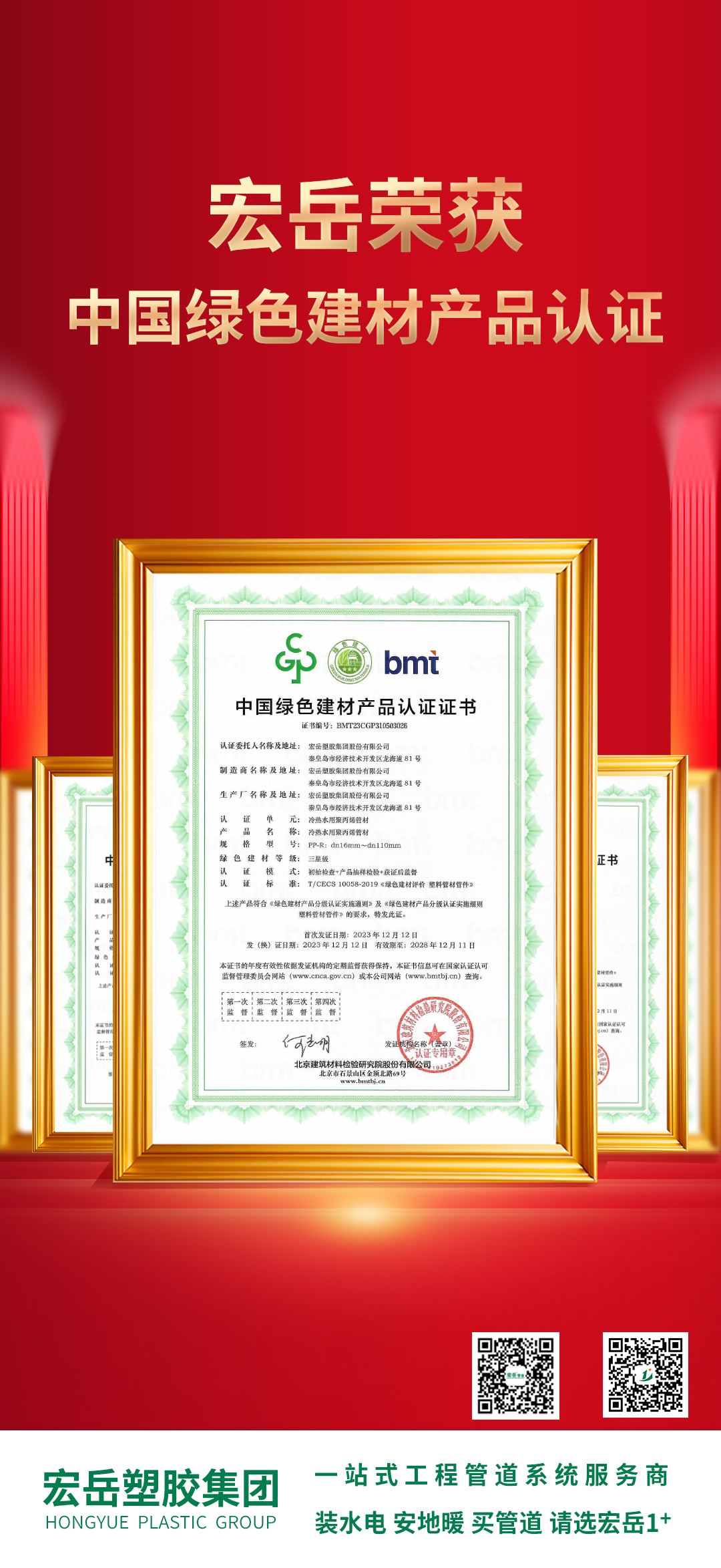 华体会体育获得中国绿色建材产品认证,本次认证对PPR、PVC、PE、PE-Xa、PE-RT管材管件等11个单元的系列产品,以环保、节能、节水、循环、低碳等评价维度进行了相关审核,华体会体育集团顺利通过。